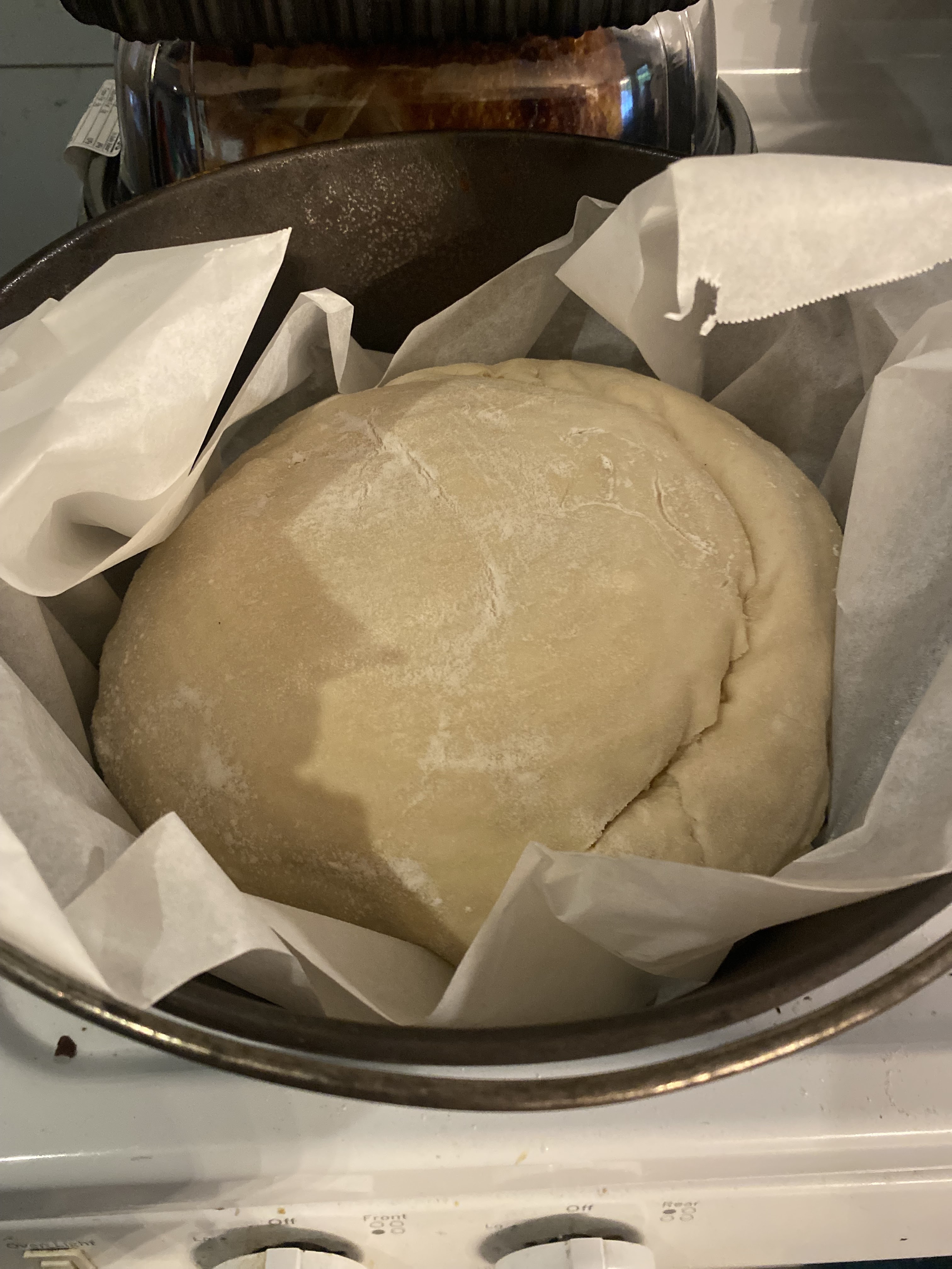 - Place dough into Dutch oven and put the lid on. Bake for 20 minutes with lid on.